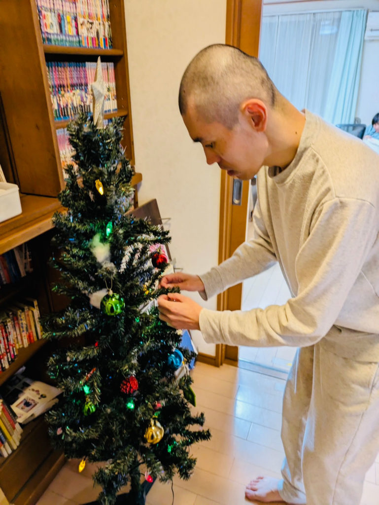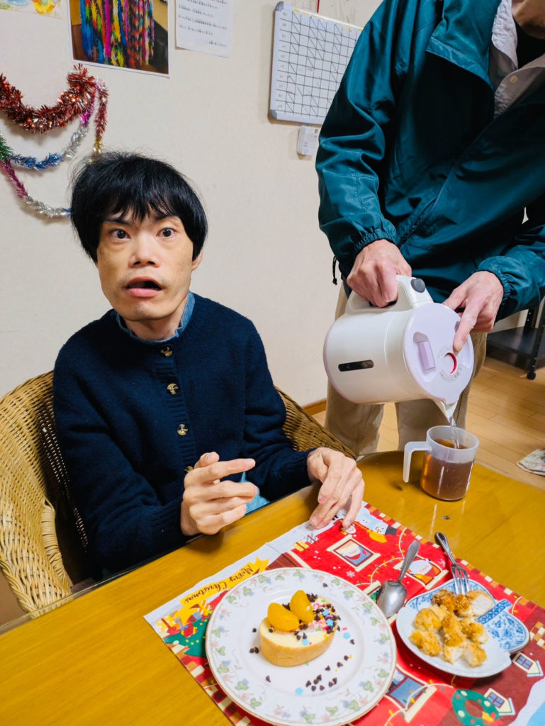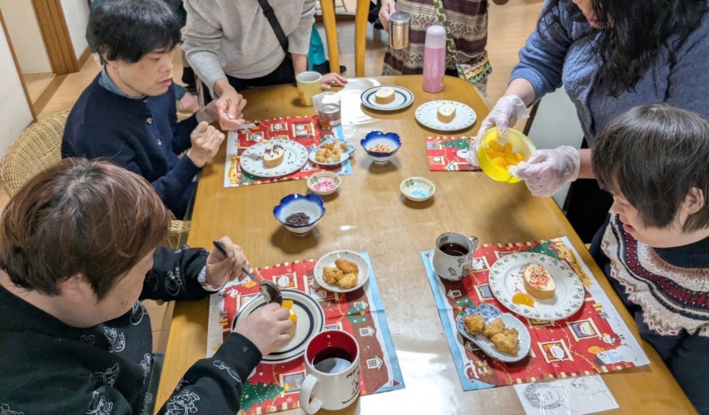 シェル・ブルーでは、クリスマス会と12月のお誕生日会を併せて行いました。仲間のひとりがハッピーバースデーを歌って祝ってくれる場面もあり、夕食にはご馳走やロールケーキが並びました。食後にはクリスマスツリーの飾り付けを行いました。