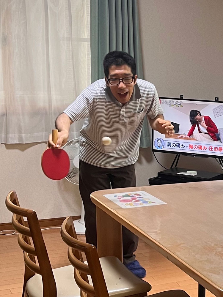 グループホームでは室内でも楽しめる活動を取り入れています。余暇時間に、リビングのテーブルを使って卓球に仲間たちを誘うこともあります。