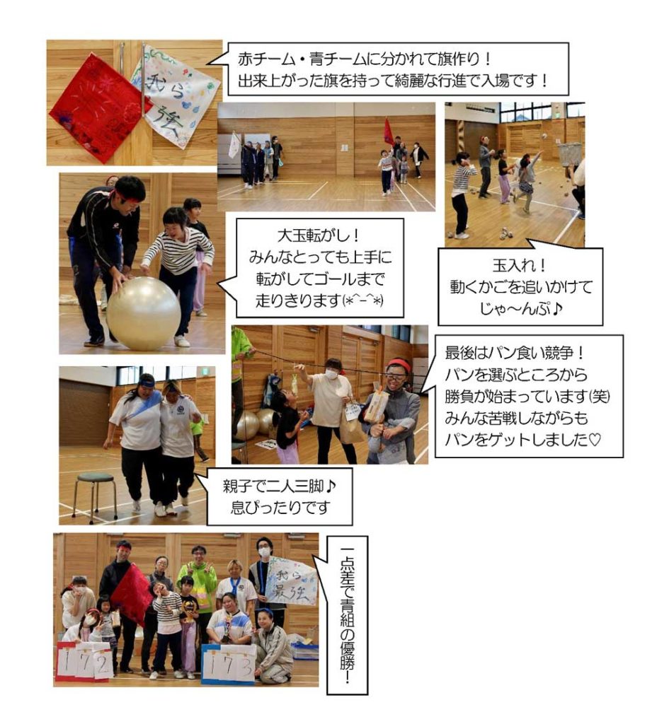 ずっと楽しみにしていた運動会の日!あいにくの雨でしたが・・・喜望園さんのホールをお借りして、運動会を行いました!今回は色々と予定が合わず、参加は少数でしたが・・・大盛り上がりの運動会となりました!